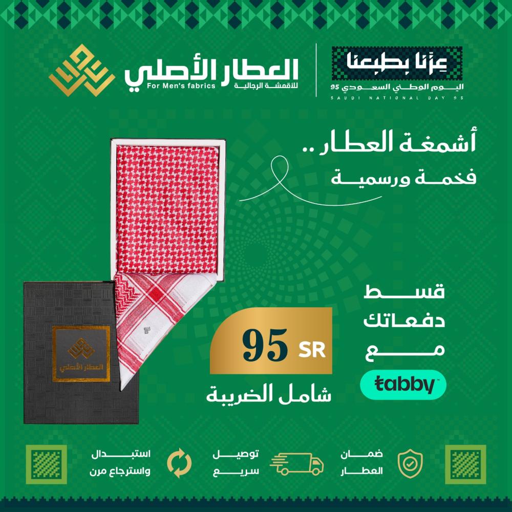 تمت حياكة شماغ العطار بالكامل من خيوط مصنوعة من قطن طبيعي 100% ذو جودة عالية.أطراف الغتر متطابقة من كلا الجوانب ذات معايير سعودية وتم تصميم الغتر على يد أمهر المحترفين في مجال صناعة الاشمغة .